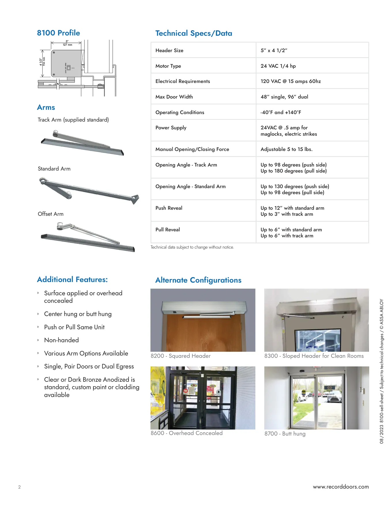 Opening/closing forces are adjustable to meet ADA objectives and accommodate weatherstrip drag.